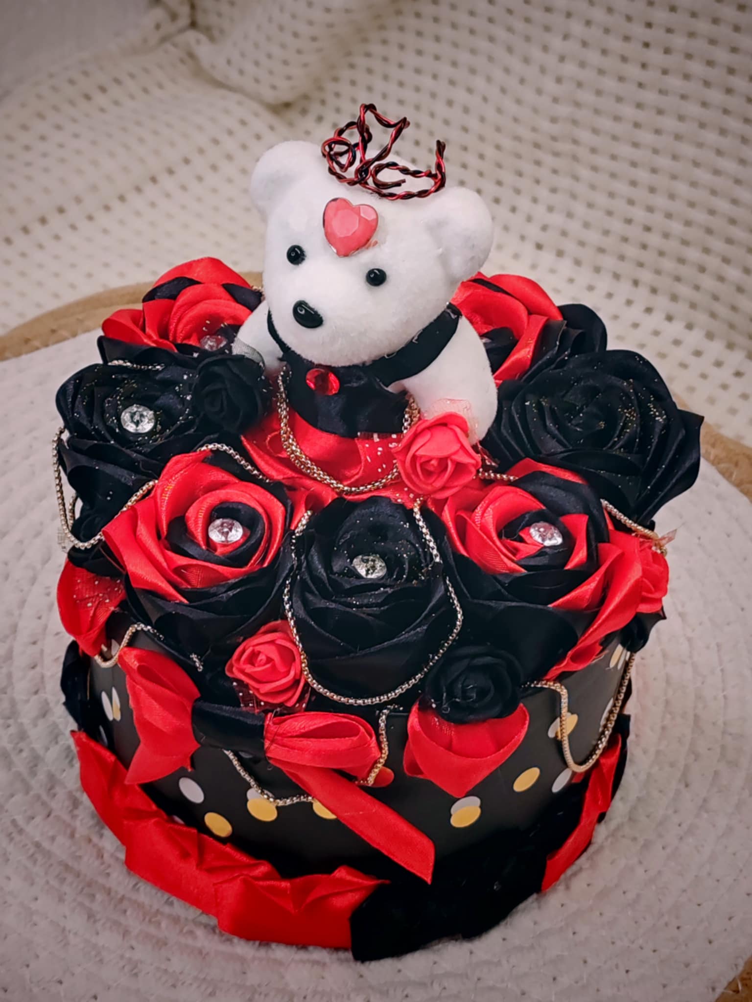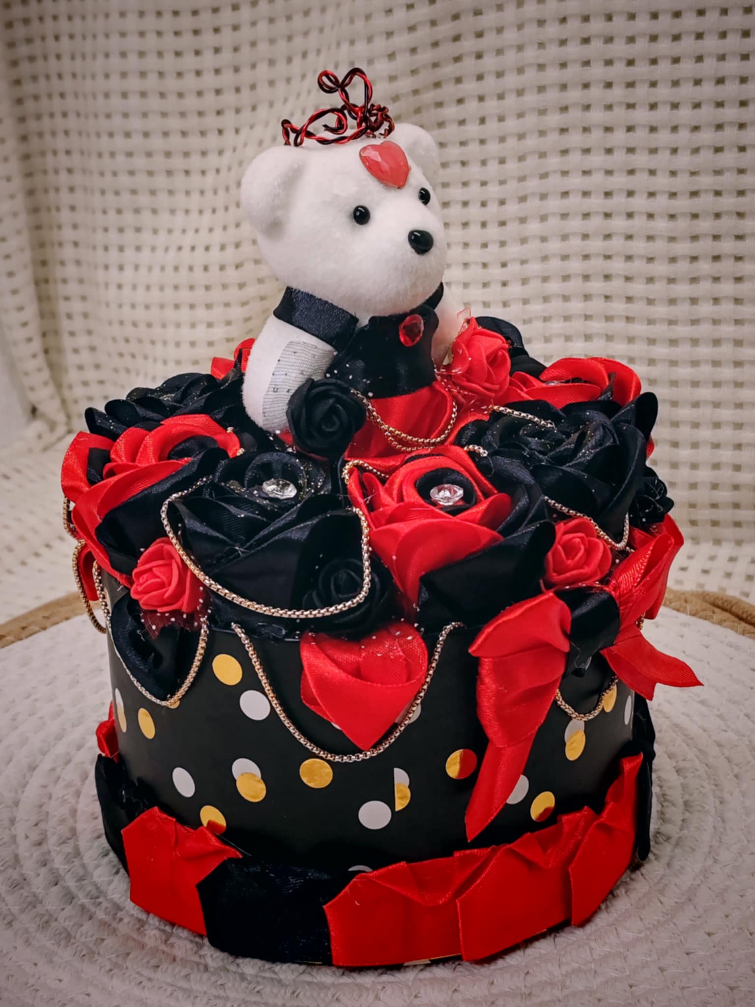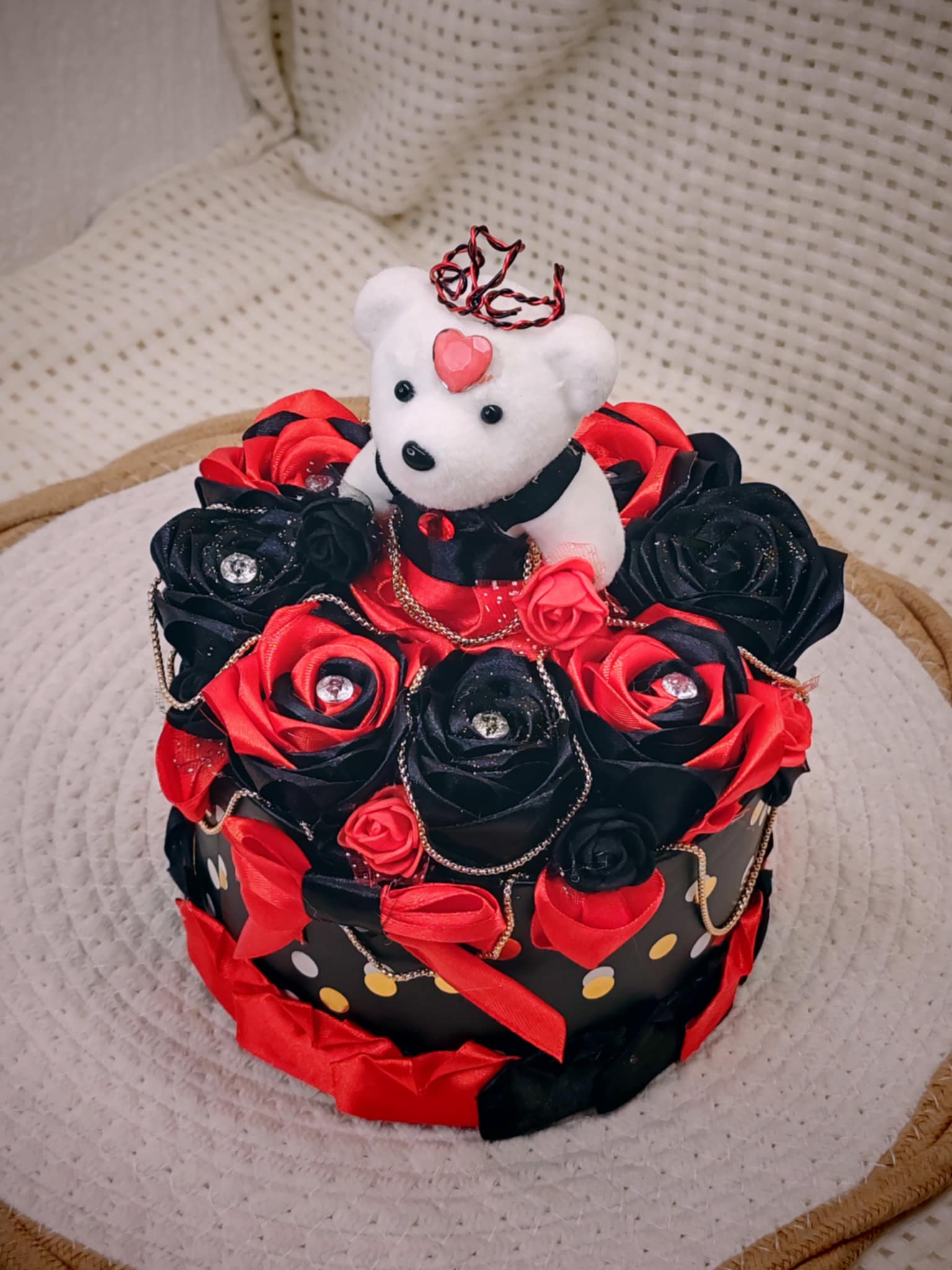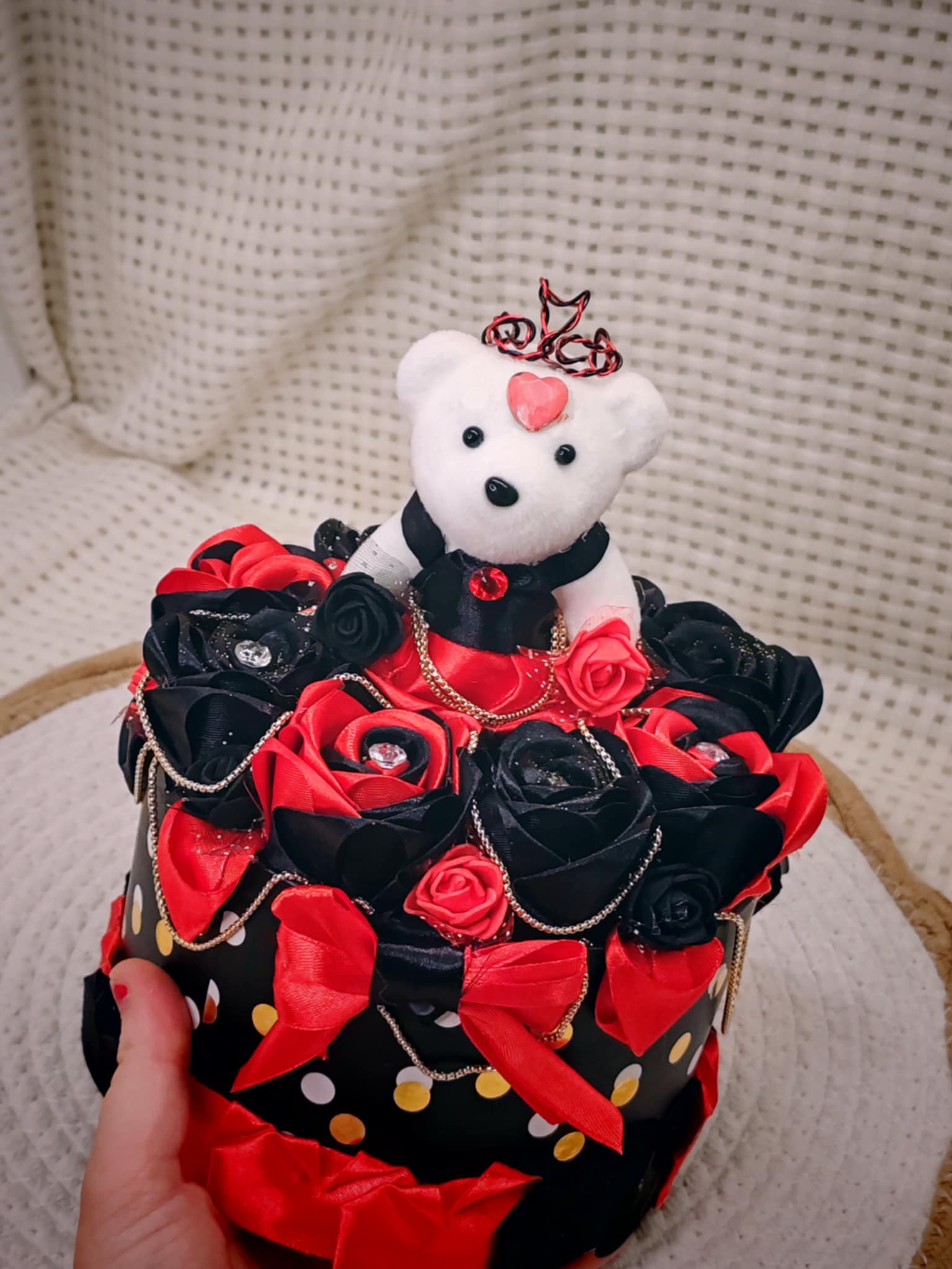 Composée de roses délicatement façonnées en ruban, cette création est présentée dans une boîte raffinée, elle-même décorée avec soin pour sublimer l’ensemble. 💝