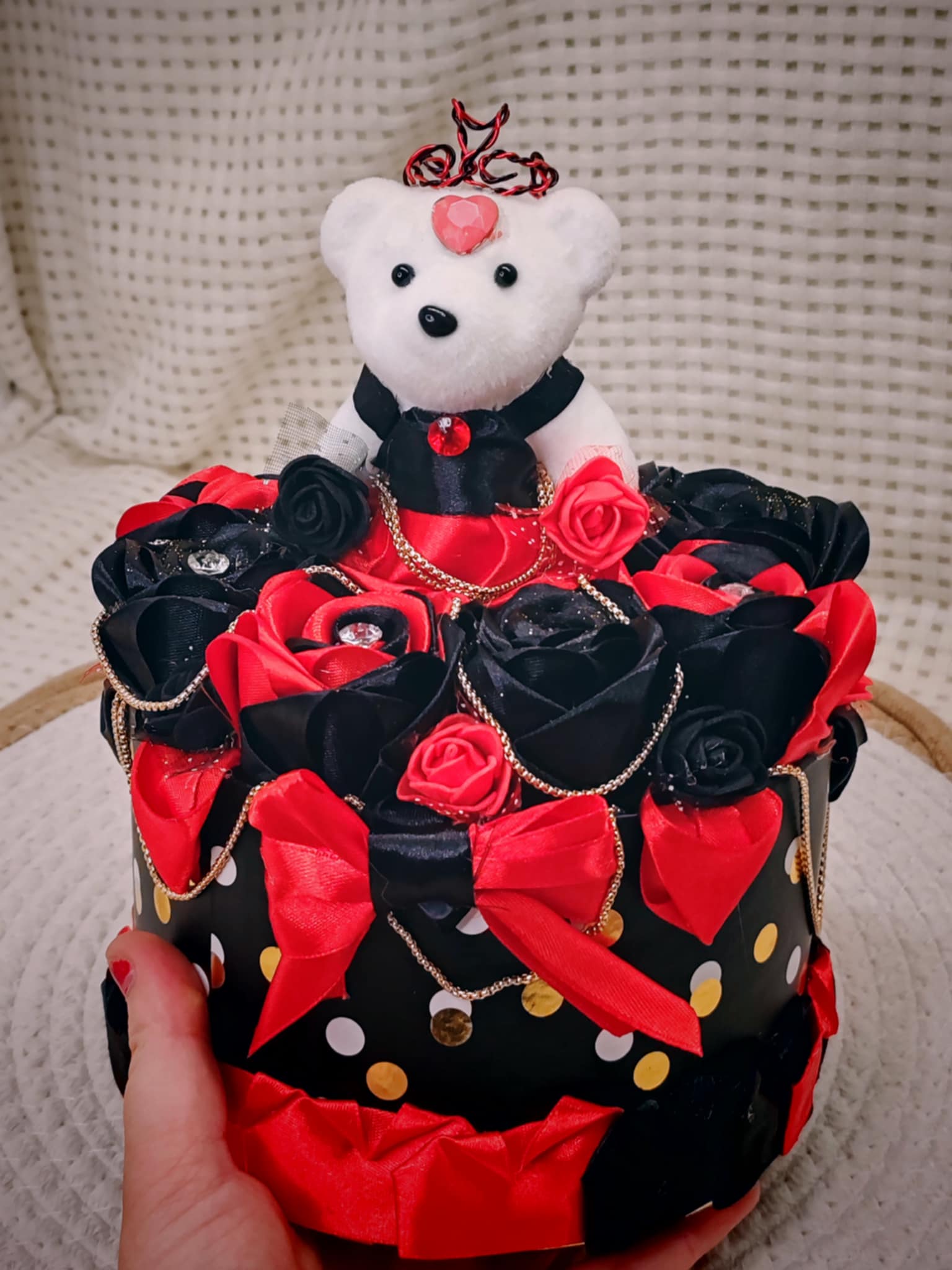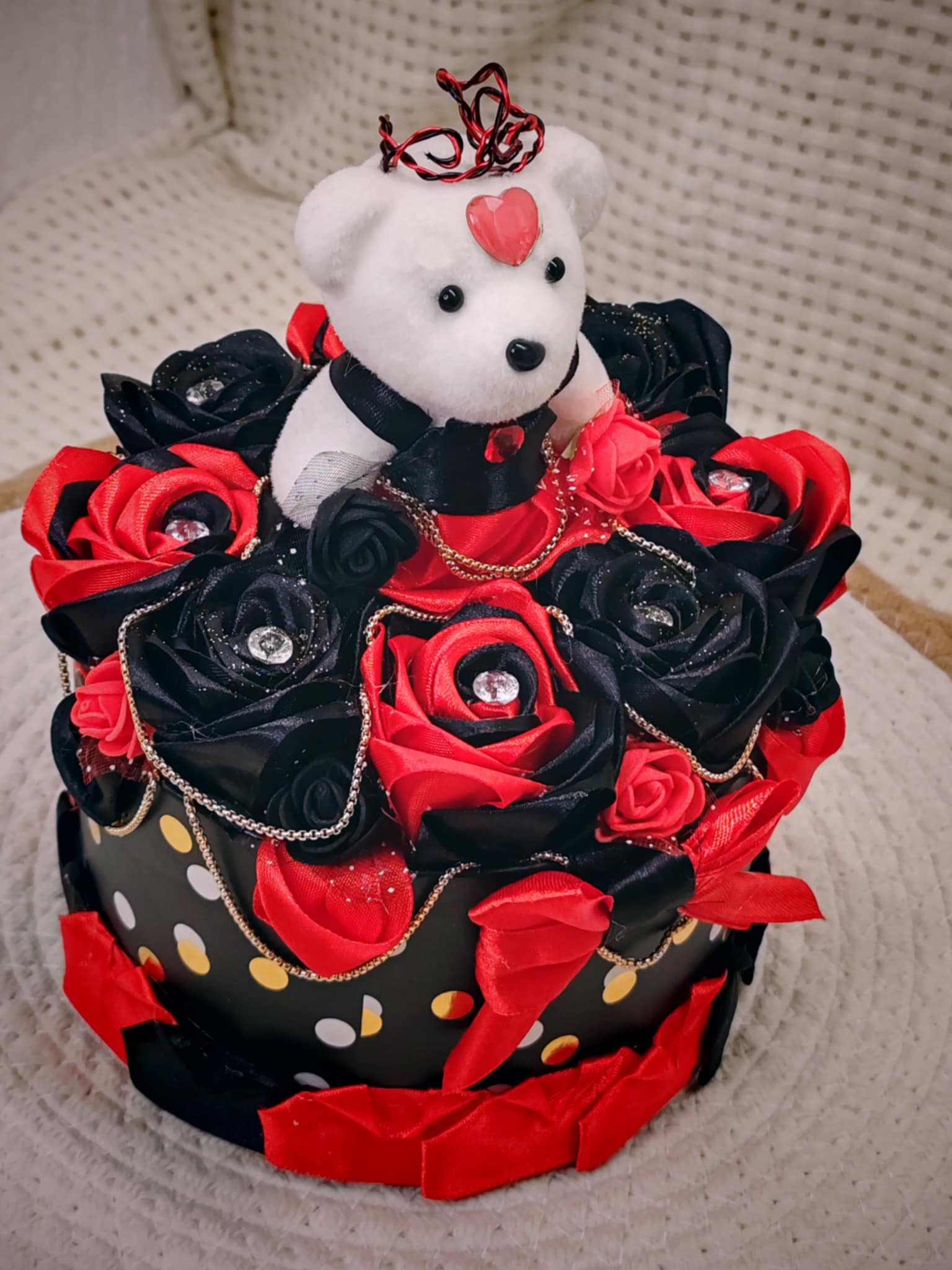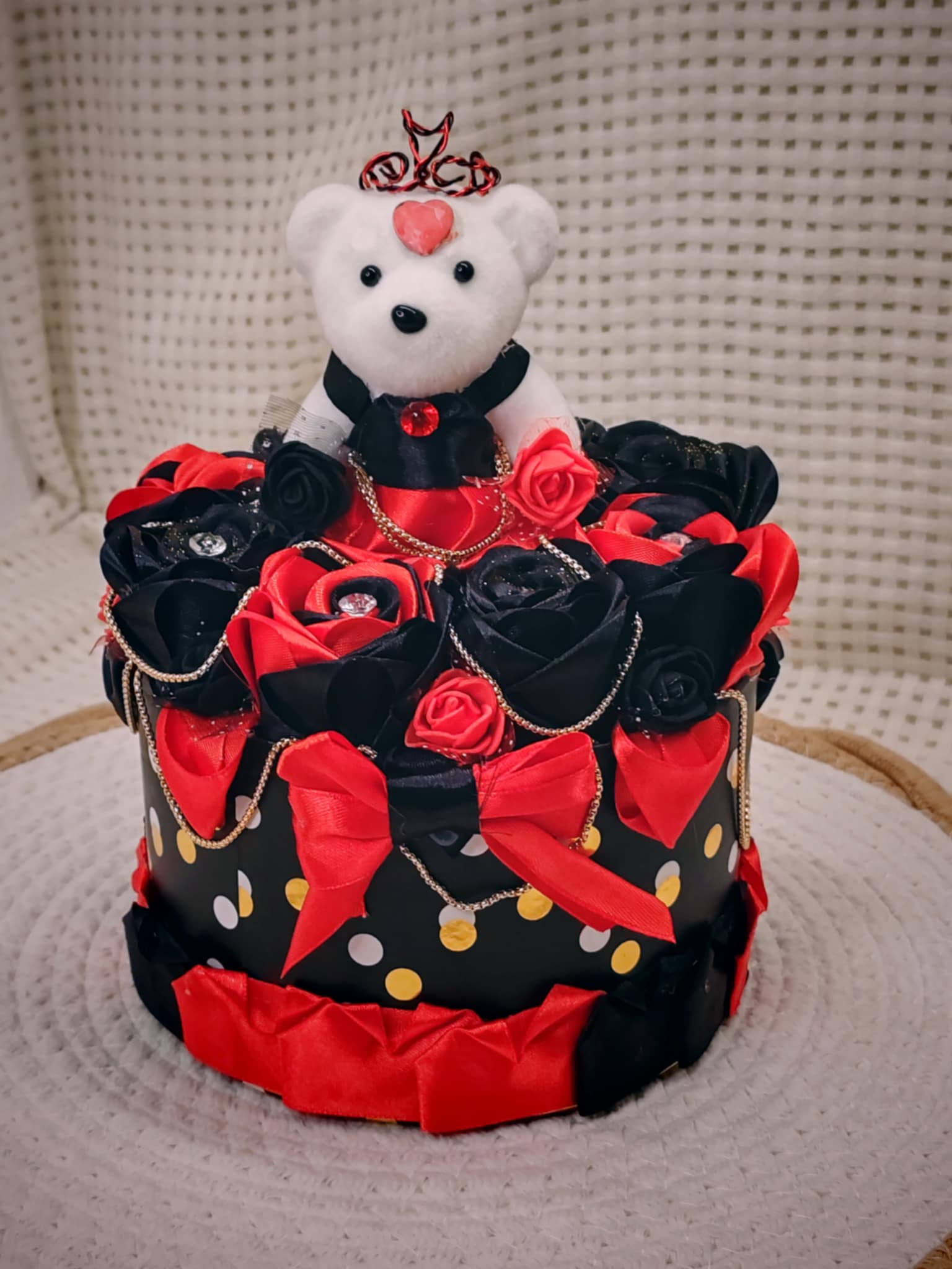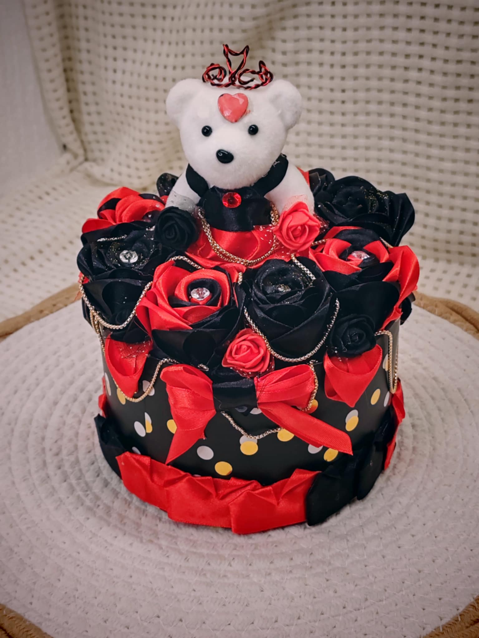 Composée de roses délicatement façonnées en ruban, cette création est présentée dans une boîte raffinée, elle-même décorée avec soin pour sublimer l’ensemble. 💝