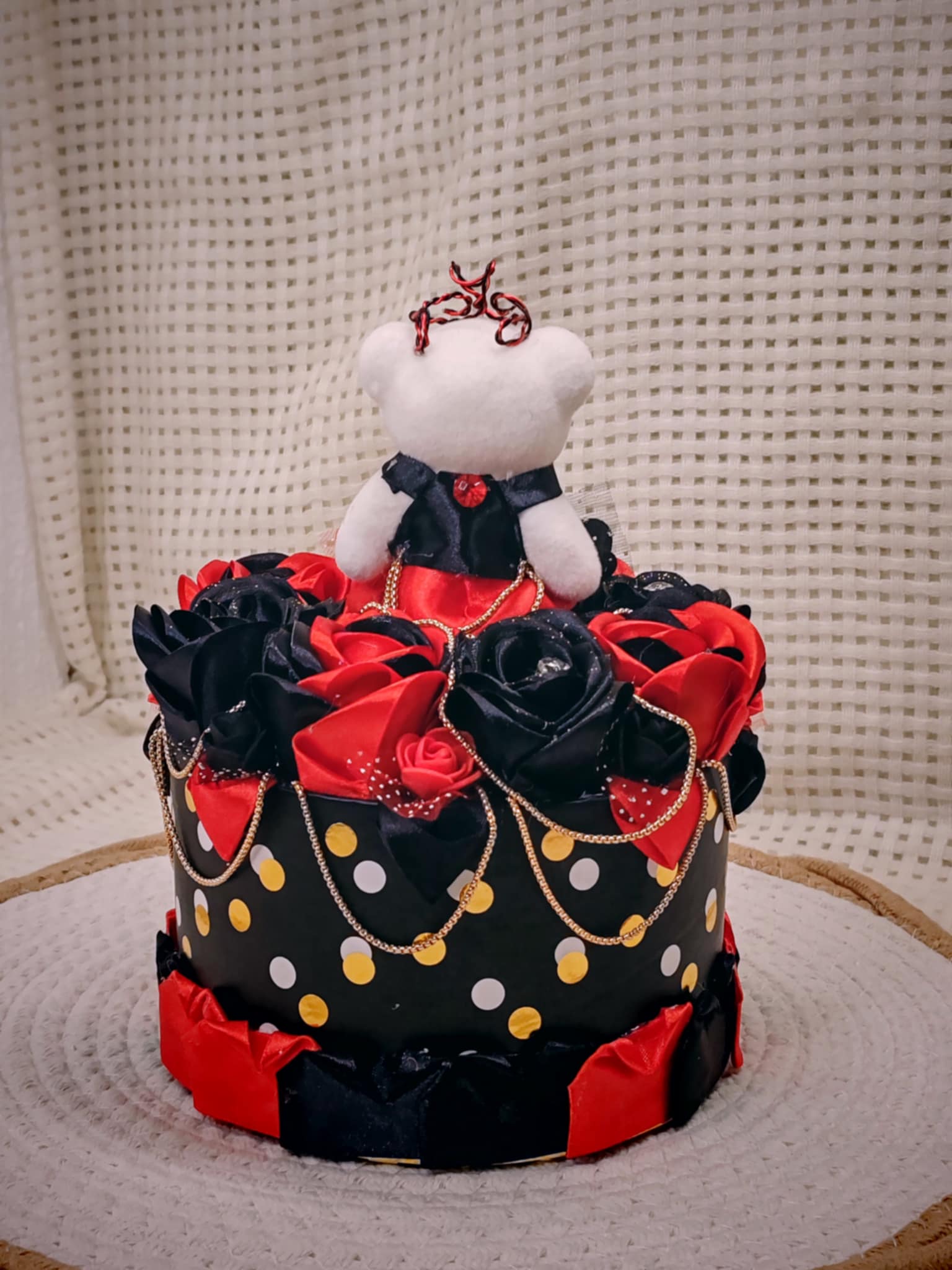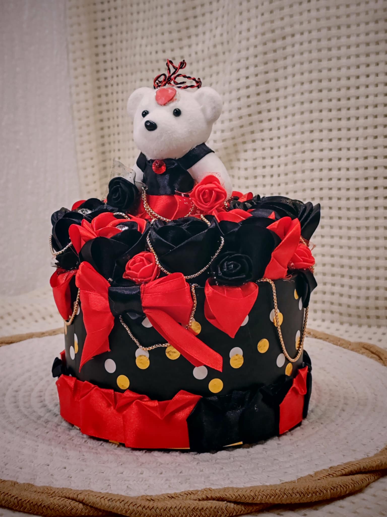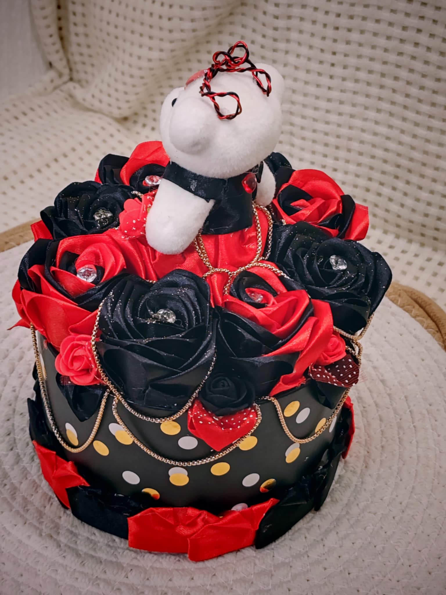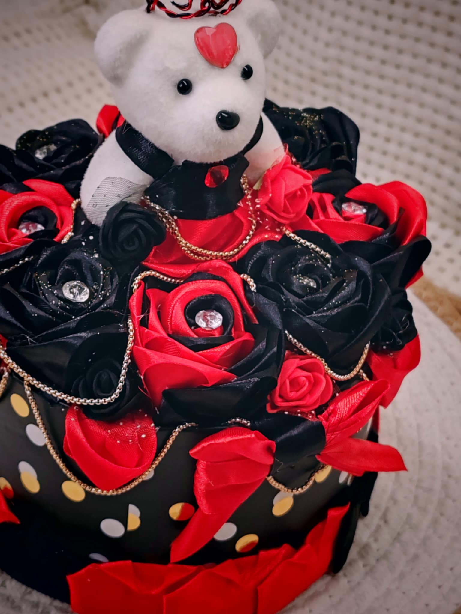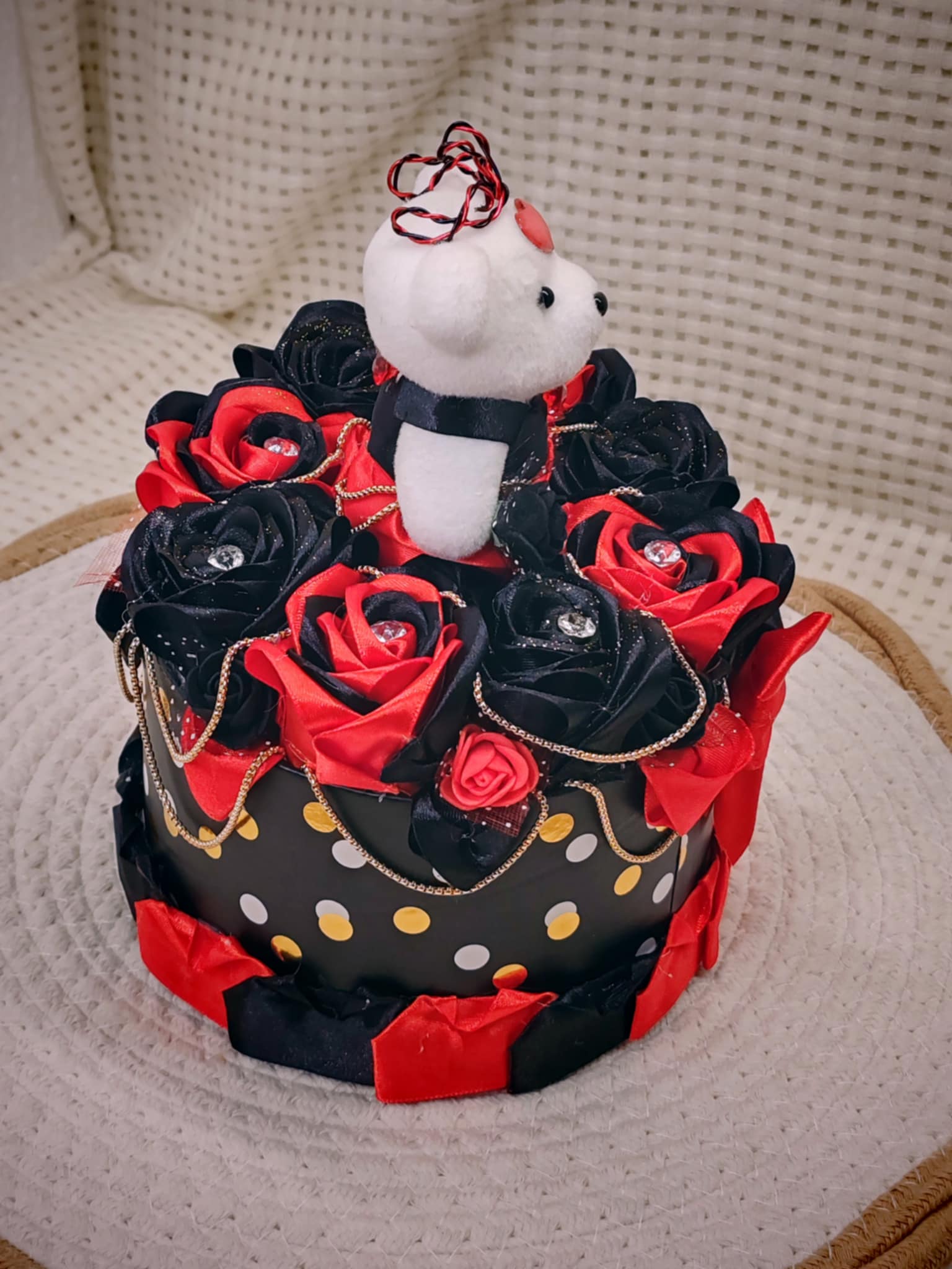 Composée de roses délicatement façonnées en ruban, cette création est présentée dans une boîte raffinée, elle-même décorée avec soin pour sublimer l’ensemble. 💝