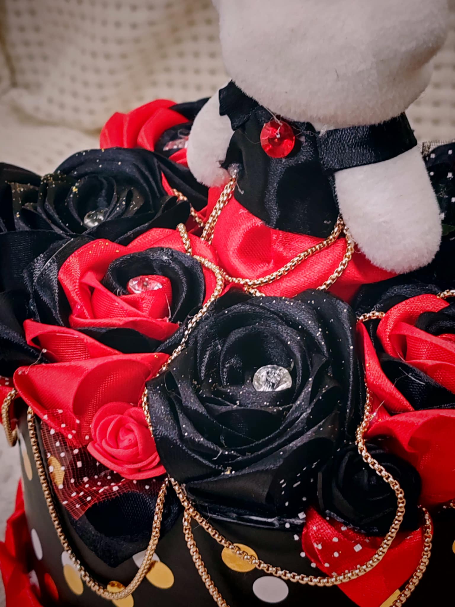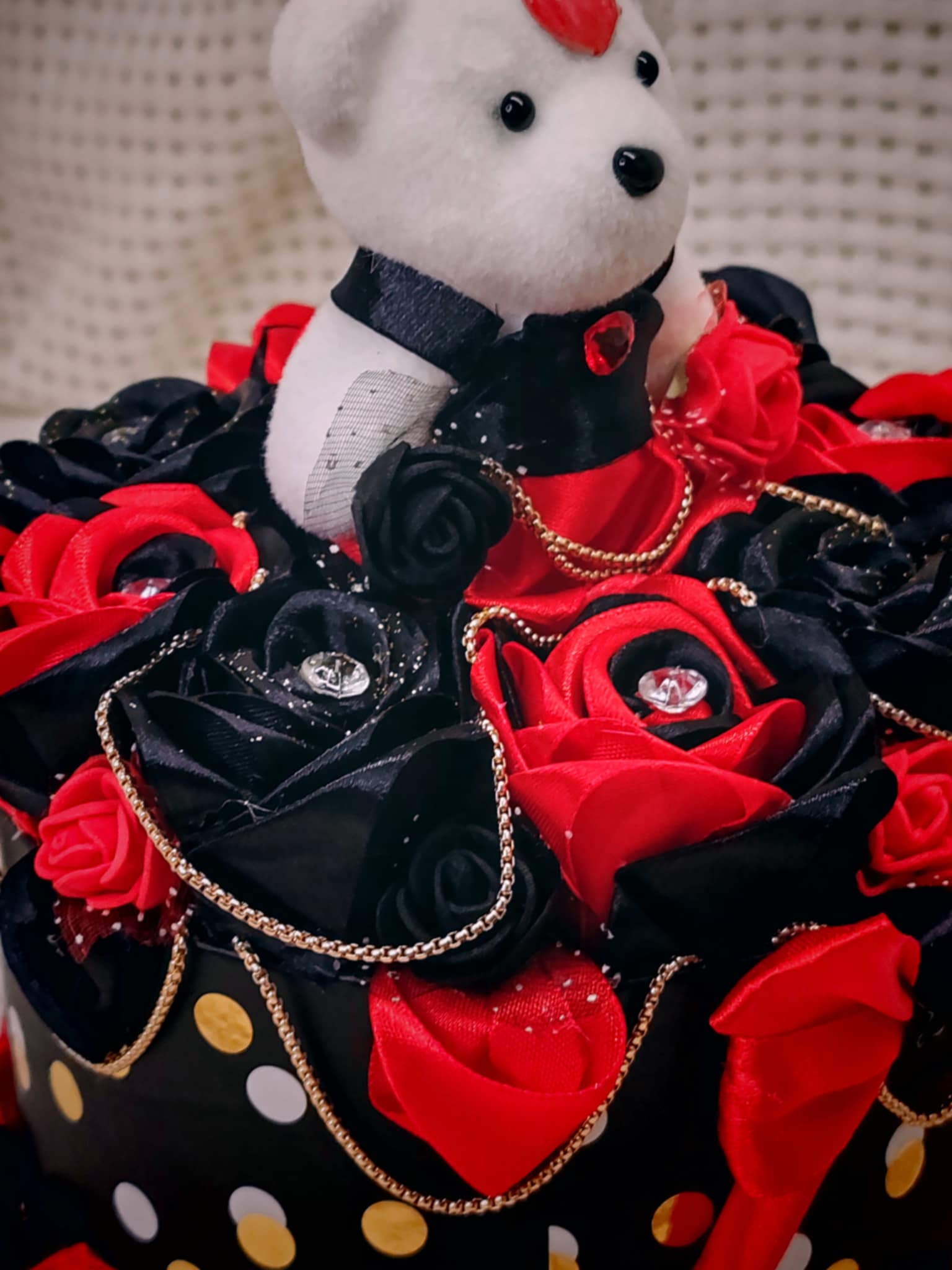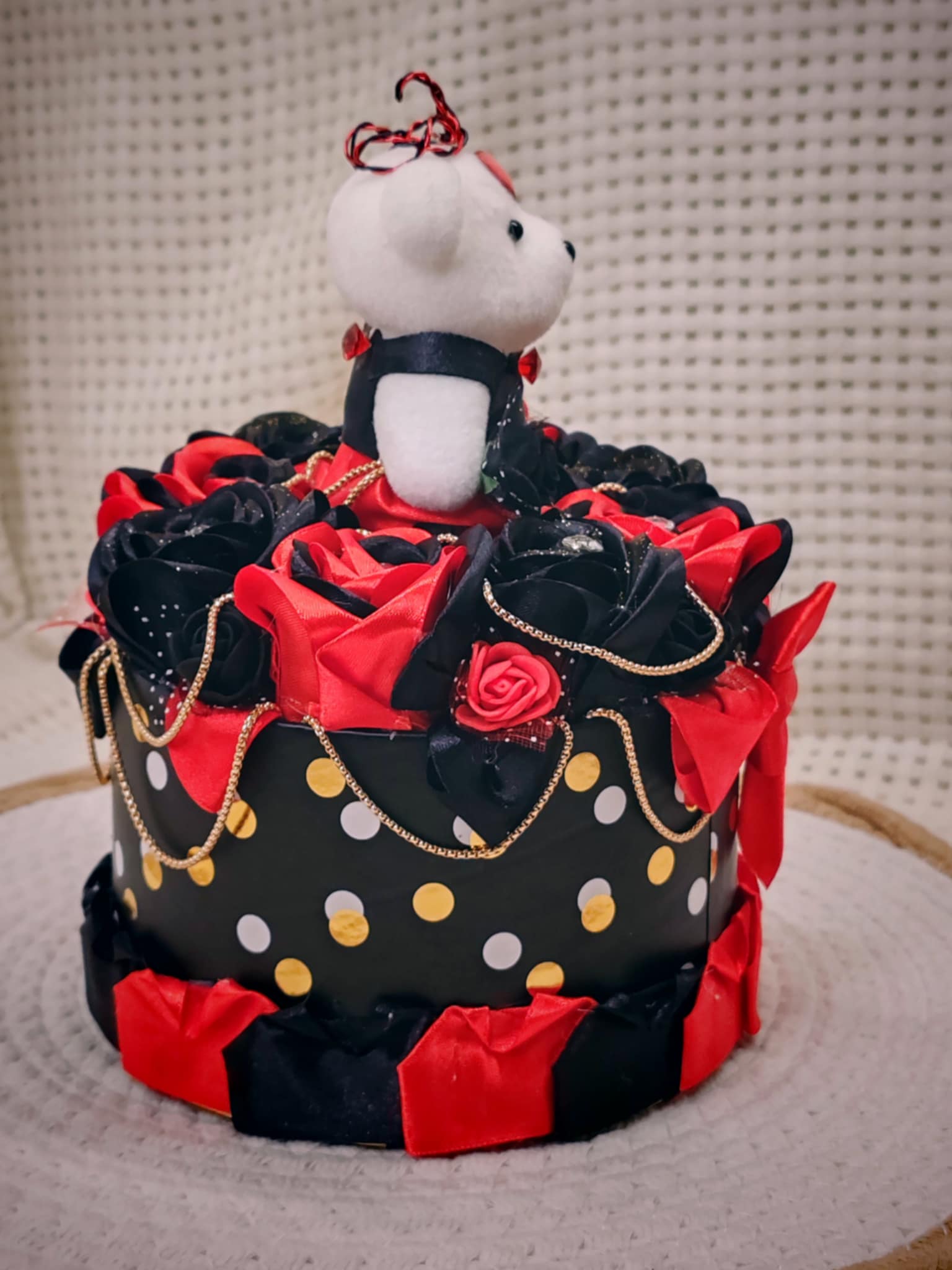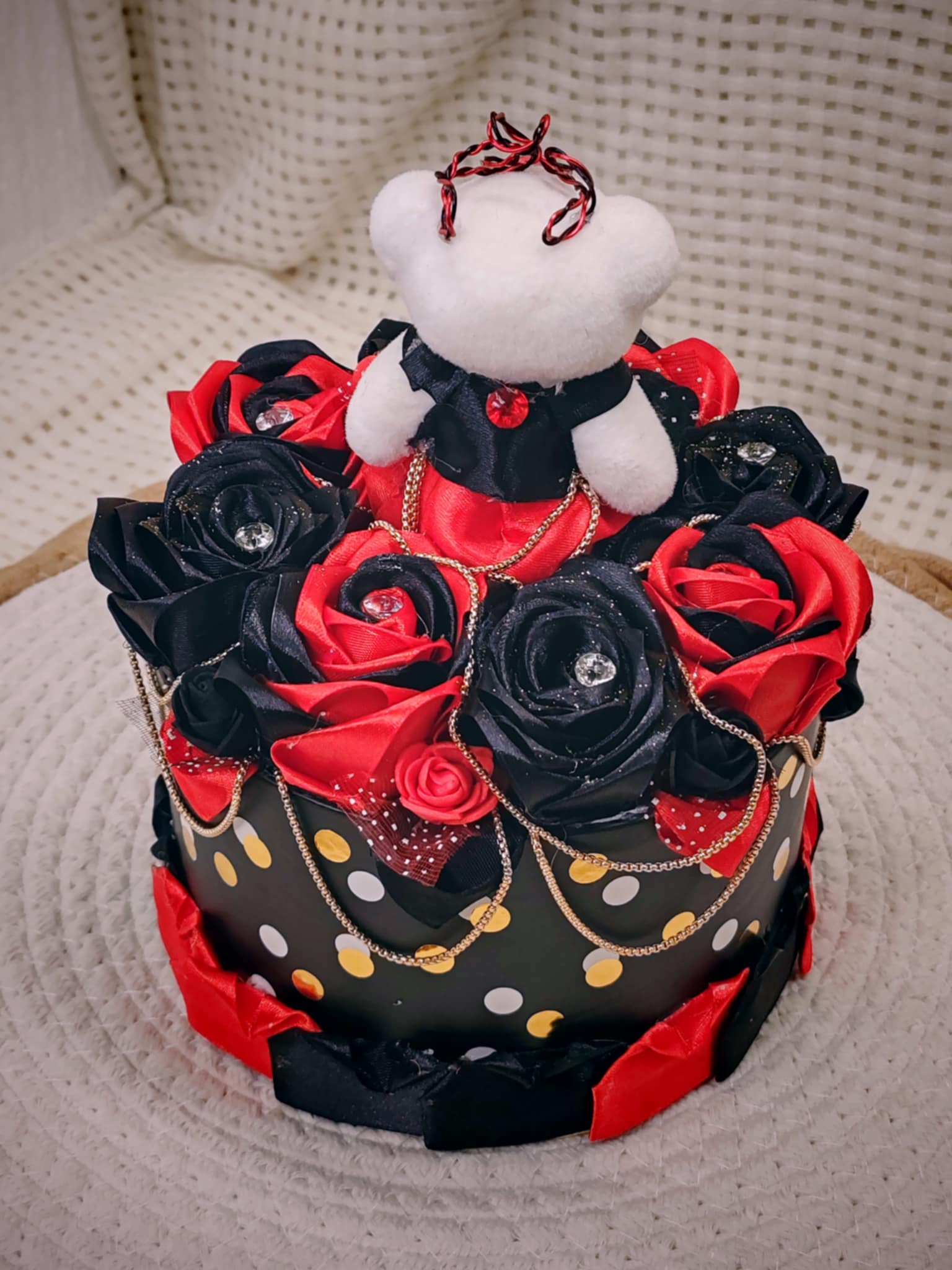 Composée de roses délicatement façonnées en ruban, cette création est présentée dans une boîte raffinée, elle-même décorée avec soin pour sublimer l’ensemble. 💝