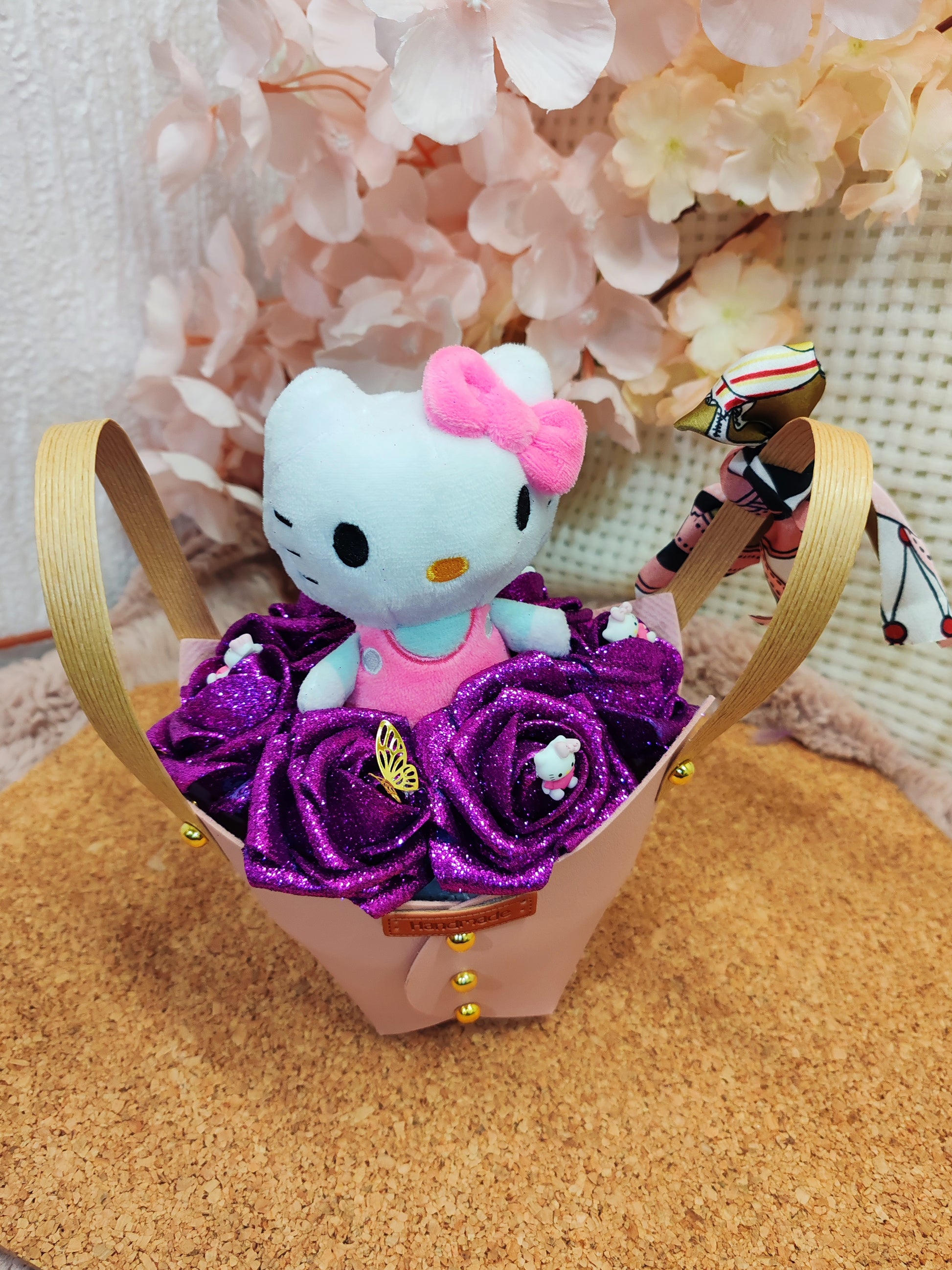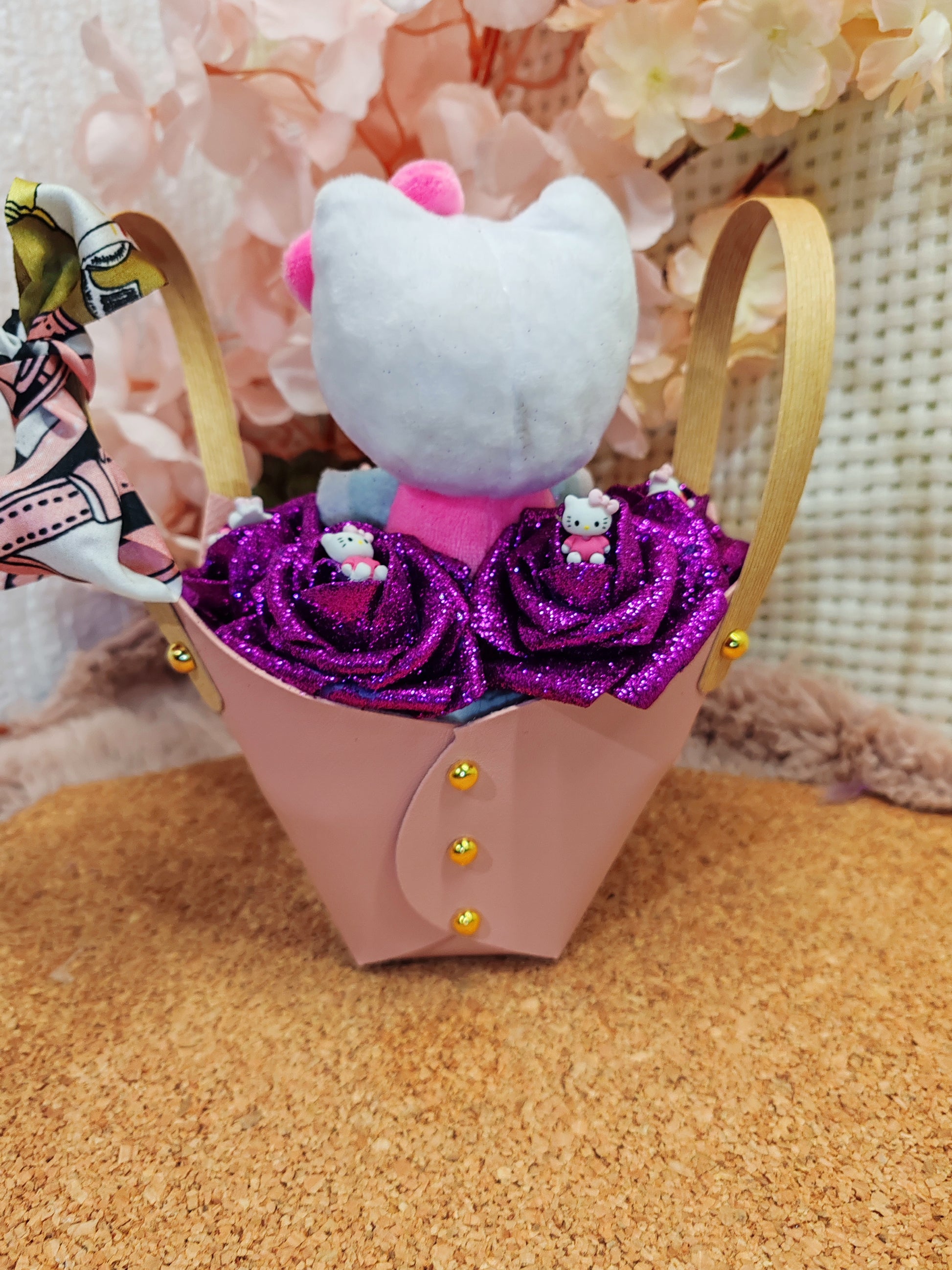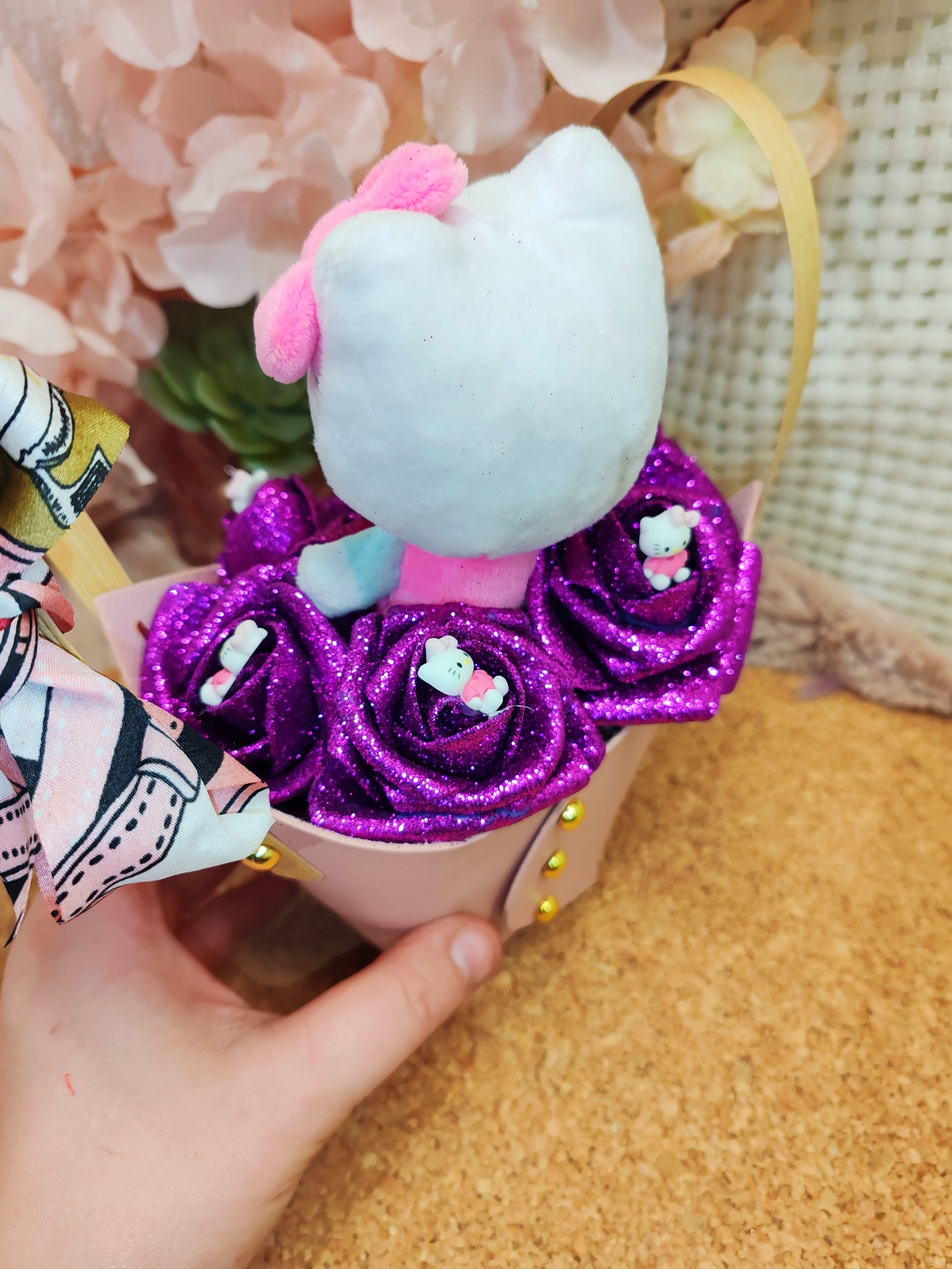 Décoration florale unique – Roses en mousse & figurine hello Kitty 🌸